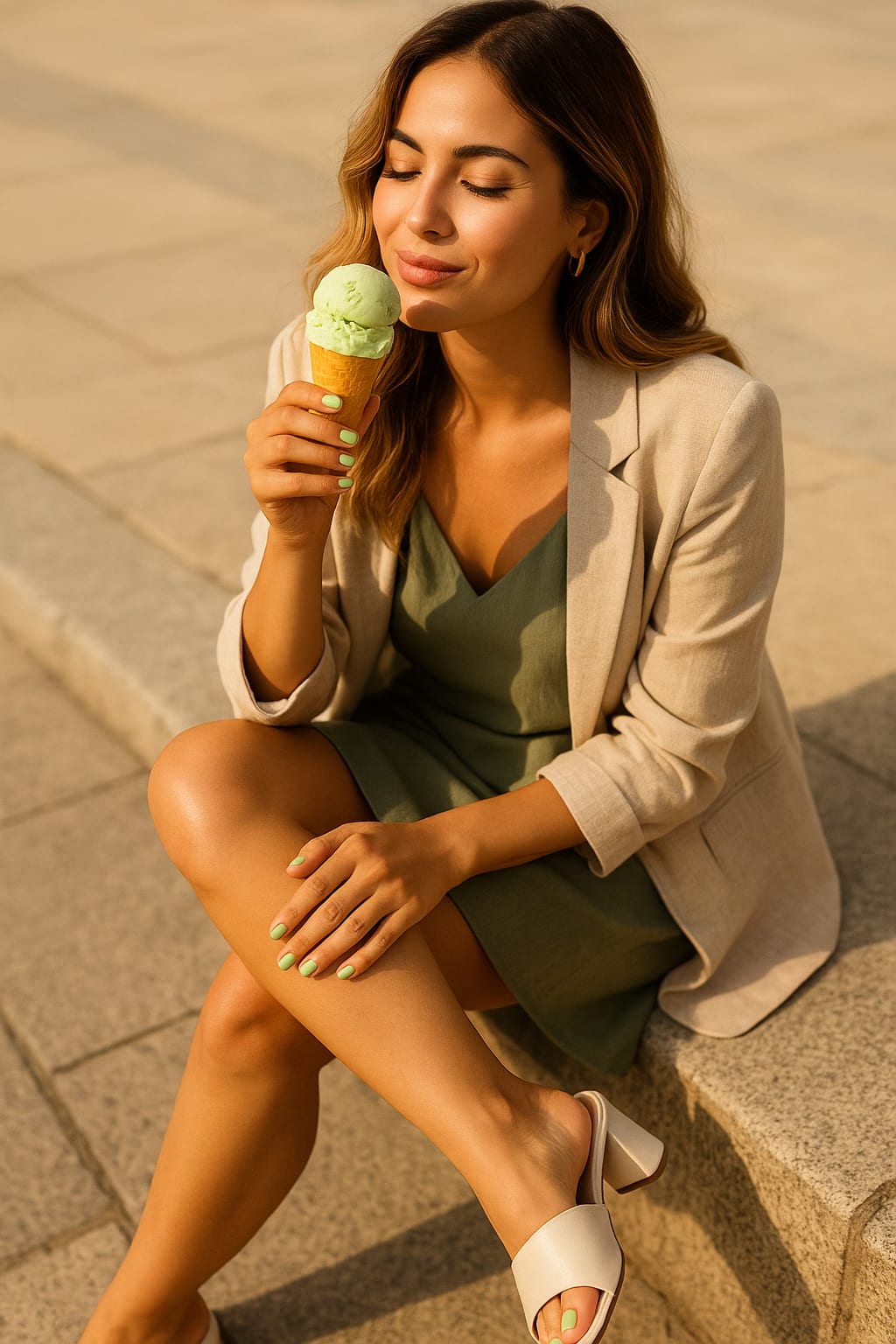 Contrast It Right: For evening, balance the soft green with a sleek black slip dress and gold accessories—your feet do the talking.