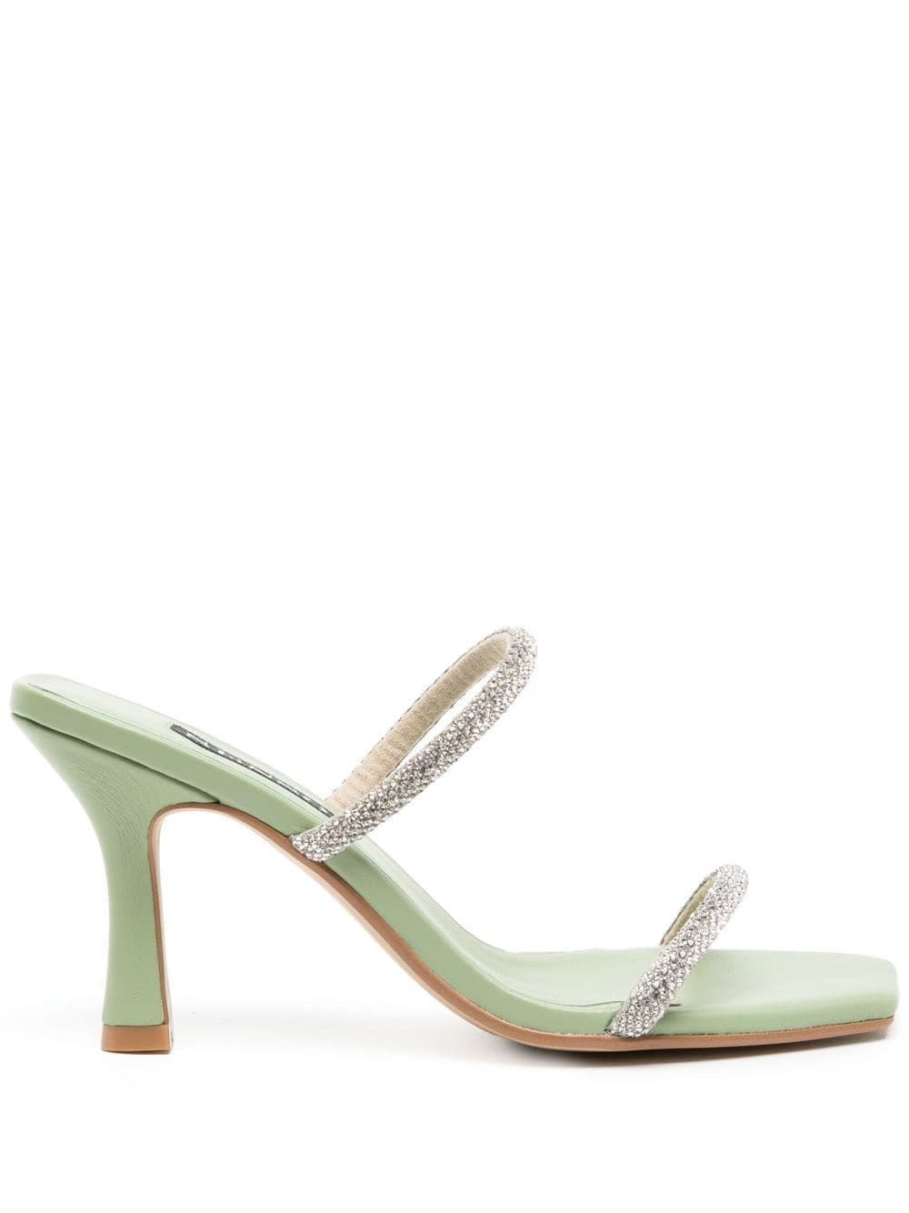 Foot styles to watch: square-toe loafers, latex slip-ons, chain-embellished mules—all in soft green glory.